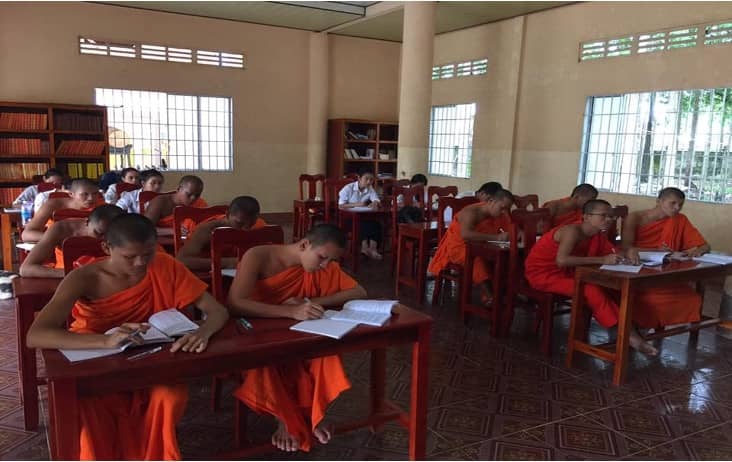 In small villages scattered across the Mekong Delta, the temples, or known in Khmer as Wat (វត្ត), became the last sanctuaries of the Khmer-Krom language. Inside these sacred spaces, barefoot children gathered after school or at dawn, learning to trace the graceful curves of Khmer script on chalkboards under the guidance of monks. These Buddhist monks, often young themselves, risked punishment and surveillance to preserve their heritage. Their mission was simple but powerful: to ensure that future generations would still know who they are.