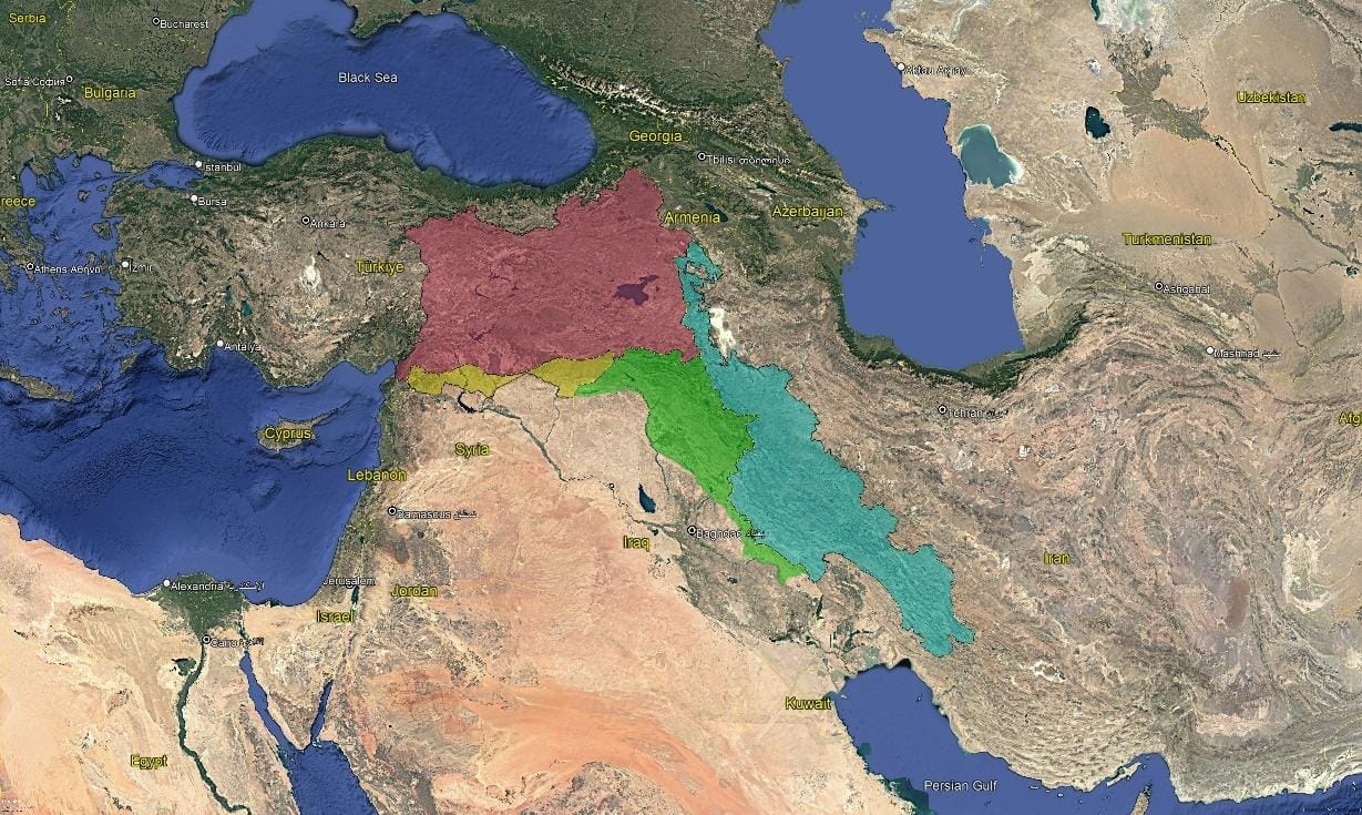 Greater Kurdistan, historically home to the Kurdish people, covers parts of four modern-day states: southeastern Turkey (Northern Kurdistan=260,000 km²), western Iran (Eastern Kurdistan=181,000 km²), northern Iraq (Southern Kurdistan=82,000 km²), and northern Syria (Western Kurdistan=25,000 km²); a total area of 548,000 km². Its diverse landscapes defined the geographical properties and geomorphology. Tectonic activity, erosion, weathering, and climatic influences shape Kurdistan’s geomorphology. Understanding these physical characteristics is essential for comprehending the environmental dynamics and challenges.